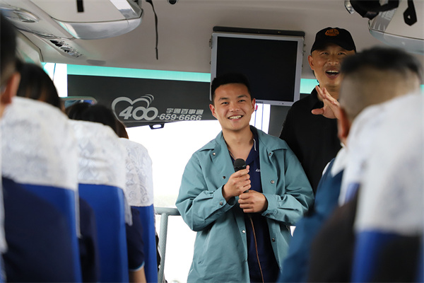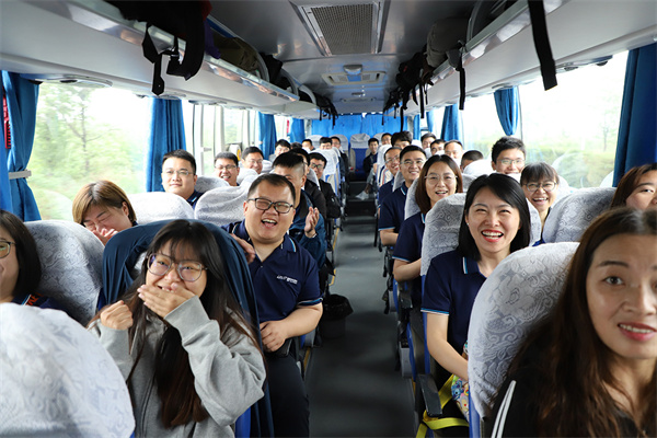 5月15日七點(diǎn)半,營銷系統(tǒng)全體成員正式出發(fā),踏上了一場充滿未知和挑戰(zhàn)的旅途。小伙伴們的內(nèi)心或許有些忐忑,但車上愈發(fā)高漲的互取代號(hào)的破冰環(huán)節(jié)讓大家逐漸卸去拘謹(jǐn)?shù)耐鈿?,沉浸在輕松愉悅的氛圍中。