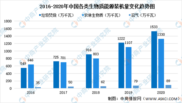 依據(jù)來源的不同,可以將適合于能源利用的生物質(zhì)分為林業(yè)資源、農(nóng)業(yè)資源、生活污水和工業(yè)有機(jī)廢水、城市固體廢物和畜禽糞便等五大類。其中,用來發(fā)電資源主要為垃圾焚燒、農(nóng)林生物質(zhì)及沼氣。數(shù)據(jù)顯示,2020年垃圾焚燒發(fā)電累計(jì)裝機(jī)達(dá)到1533萬千瓦;農(nóng)林生物質(zhì)發(fā)電2020年累計(jì)裝機(jī)達(dá)到1330萬千瓦;沼氣發(fā)電方面2020年累計(jì)裝機(jī)達(dá)到89萬千瓦。