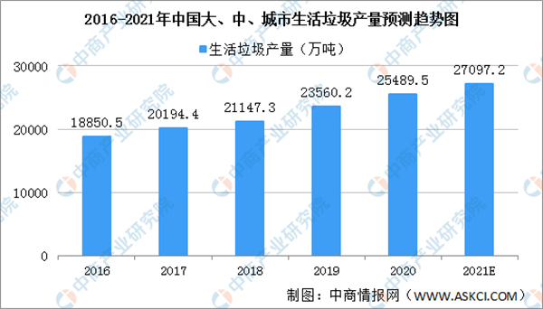 我國是人口大國,也是垃圾產(chǎn)生大國,且隨著經(jīng)濟(jì)穩(wěn)步發(fā)展、民眾生活消費(fèi)水平、城鎮(zhèn)化率不斷提高,生活垃圾產(chǎn)生量持續(xù)增加。2016年我國大、中城市生活垃圾產(chǎn)生量18850.5萬噸,2019年生活垃圾產(chǎn)生量增至23560.2萬噸,預(yù)計(jì)2021年我國生活垃圾產(chǎn)量27097.2萬噸。