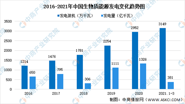 數(shù)據(jù)顯示,2020年,全國生物質(zhì)發(fā)電新增裝機(jī)543萬千瓦,累計(jì)裝機(jī)達(dá)到2952萬千瓦,同比增長22.6%;2020年生物質(zhì)發(fā)電量1326億千瓦時(shí),同比增長19.4%;2021年第一季度,生物質(zhì)發(fā)電裝機(jī)3148.5萬千瓦,生物質(zhì)發(fā)電380.8億千瓦時(shí)。