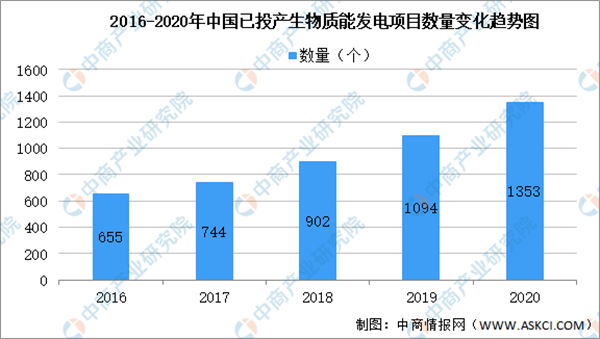 隨著我國對生物質(zhì)能發(fā)電越來越重視,我國生物質(zhì)發(fā)電相關(guān)項(xiàng)目量也在不斷增多。數(shù)據(jù)顯示,我國已投產(chǎn)生物質(zhì)能發(fā)電項(xiàng)目由2016年655個(gè)增至2020年1353個(gè),年均復(fù)合增長率為19.9%。
