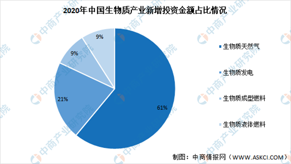 數(shù)據(jù)顯示,2020年我國生物質(zhì)產(chǎn)業(yè)新增投資金額中,生物質(zhì)天然氣占比最大達(dá)61%,生物質(zhì)發(fā)電占比達(dá)21%,生物質(zhì)成型燃料及生物質(zhì)液體燃料占比均達(dá)9%。