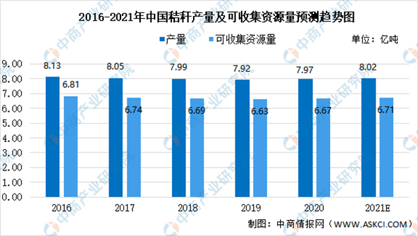 秸稈是一種很好的清潔可再生能源,是最具開發(fā)利用潛力的新能源之一,分為秸稈氣化發(fā)電和秸稈燃燒發(fā)電。數(shù)據(jù)顯示,2020年我國秸稈產(chǎn)量達(dá)7.97億噸,可收集的秸稈資源量達(dá)6.67億噸。據(jù)預(yù)測,2021年我國秸稈產(chǎn)量可達(dá)8.02億噸,可收集的秸稈資源量達(dá)6.71億噸。
