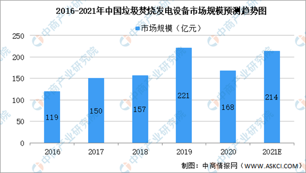 焚燒爐作為垃圾焚燒處理系統(tǒng)最核心的設(shè)備,其設(shè)計(jì)需充分考慮垃圾停留時(shí)間、燃燒溫度、煙氣在爐內(nèi)的停留時(shí)間及紊流等因素,從而達(dá)到完全燃燒、控制惡臭及二噁英類物質(zhì)產(chǎn)生的目的。目前國內(nèi)外應(yīng)用較多、技術(shù)比較成熟的生活垃圾焚燒爐主要包括爐排爐型焚燒爐、流化床焚燒爐等。2020年,垃圾焚燒發(fā)電設(shè)備市場規(guī)模約為168億元,預(yù)計(jì)2021年我國垃圾焚燒發(fā)電設(shè)備市場規(guī)??蛇_(dá)214億元。