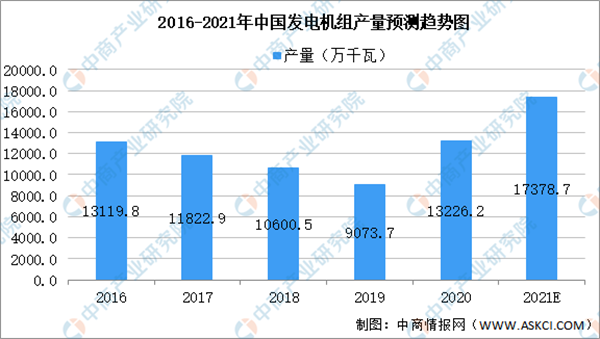 一般我們常見的發(fā)電機(jī)組通常由汽輪機(jī)、水輪機(jī)或內(nèi)燃機(jī)(汽油機(jī)、柴油機(jī)等發(fā)動(dòng)機(jī))驅(qū)動(dòng),可再生新能源包括核能、風(fēng)能、太陽能、生物質(zhì)能、海洋能等。數(shù)據(jù)顯示,我國發(fā)電機(jī)組產(chǎn)量呈波動(dòng)趨勢,2020年我國發(fā)電機(jī)組產(chǎn)量達(dá)13226.2萬千瓦,預(yù)計(jì)2021年我國發(fā)電機(jī)組產(chǎn)量可達(dá)17378.7萬千瓦。