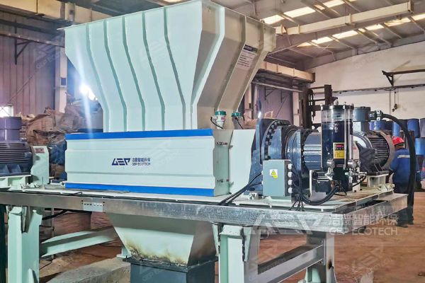 在該項目中,工業(yè)固廢通過垃圾收運車運送至項目地垃圾儲料坑中,然后經(jīng)由行車抓斗將物料抓取輸送至雙軸破碎機(jī)中,通過雙軸破碎機(jī)將物料破碎成150-200mm左右尺寸,之后通過下料溜槽運送至存料坑中與污泥一塊混合摻燒。
