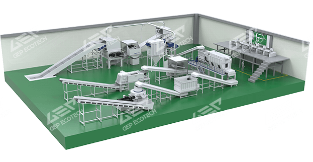 該系統(tǒng)包含一次破碎、分選、二次破碎、制粒等一系列工序,使用的設(shè)備有雙軸撕碎機、磁選機、滾筒篩分機、風(fēng)選機、細(xì)碎機、烘干機(看物料水分情況選配)、RDF成型機、鏈板機、皮帶機等。