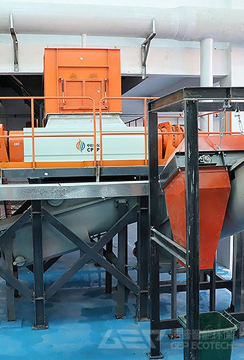 廚余垃圾由行車抓斗送至潔普廚余垃圾處置線,先由廚余垃圾破碎機進行粉碎,然后由磁選機分選出垃圾內(nèi)的金屬物品。破碎分選后的廚余垃圾再輸送到細(xì)碎和分選設(shè)備,進行有機物與無機物分離。